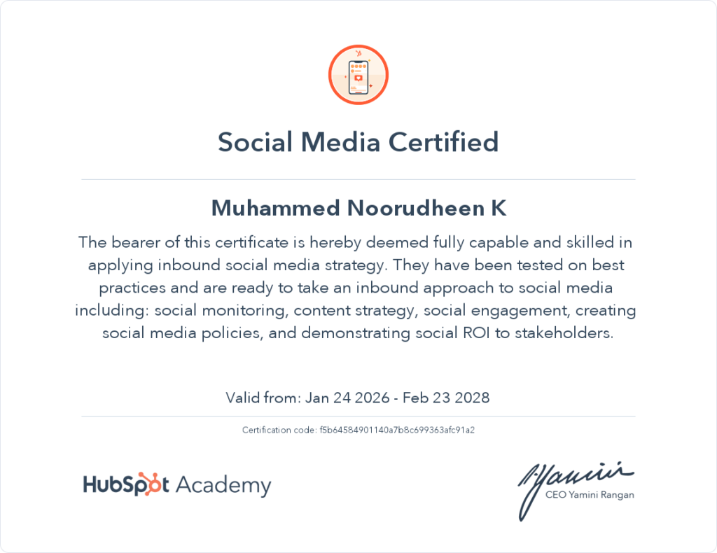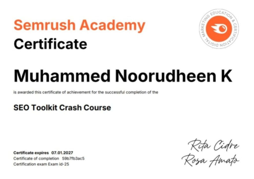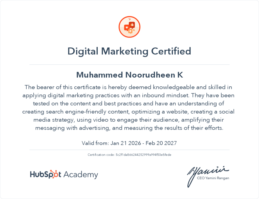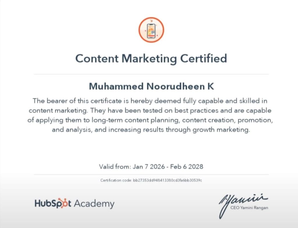 I’m Muhammed Noorudheen, a Freelance Digital Marketing Strategist from Kannur. I help businesses grow with clear and effective online strategies. I’m a BBA graduate from Pondicherry University, and I completed my digital marketing training at G-TEC MAHE, Kerala’s first and largest agency-based institute.